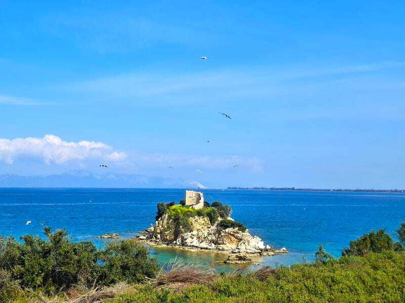 Plaża Nisiotissa jest ceniona nie tylko ze względu na czystą wodę i miłe otoczenie palm. Największą atrakcją jest widok na niewielką wysepkę z ruinami… no właśnie, nie wiadomo, wiatraka, czy zamku,